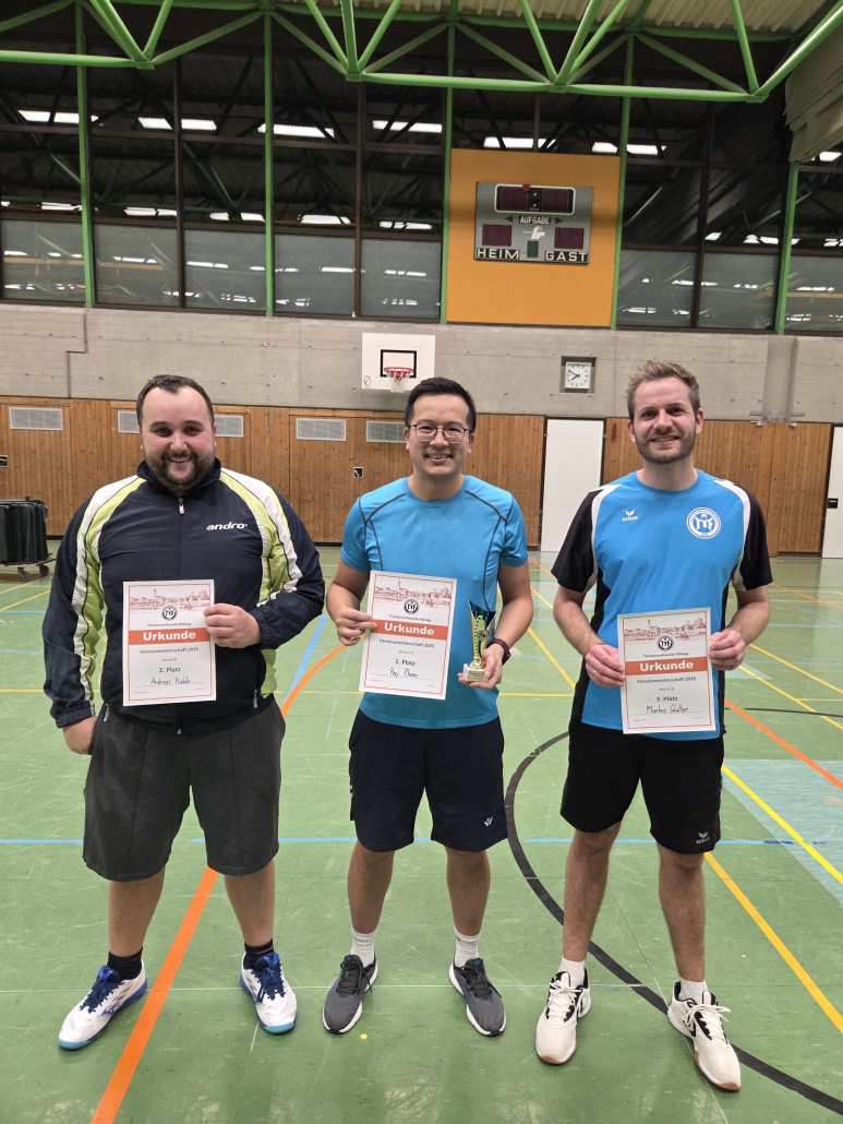 Um den Vereinsmeister-Titel bei den Herren A kämpften insgesamt 11 Teilnehmer in zwei Gruppen. Eine perfekte Gruppenphase spielten die beiden Jugendspieler David Fimpel und Lukas Müller, die ohne Satzverlust ihre beiden Gruppen gewannen. Den zweiten Gruppenrang hinter David Fimpel schnappte sich Titelverteidiger Johannes Würzer, der direkt zum Turnierauftakt das Schlüsselspiel gegen einen starken Stephan Kölsch gewann. Aus Gruppe gelang wie erwartet auch Benjamin Schick der Einzug ins Halbfinale. Beide Halbfinals sollten dramatisch werden und in fünf Sätzen entschieden werden. Würzer gelang gegen Müller erneut der Finaleinzug und Schick schaffte gegen den Turnierfavoriten Fimpel nach 0:2-Satzrückstand doch noch den Turnaround und sorgte für eine Neuauflage des letztjährigen Finals. Tief in der Verlängerung des vierten Satzes gelang Würzer tatsächlich die Titelverteidigung und sorgte für Schicks dritte Vize-Vereinsmeisterschaft in Serie. Fimpel sorgte mit seinem Sieg im kleinen Finale für das identische Podium wie im Vorjahr.